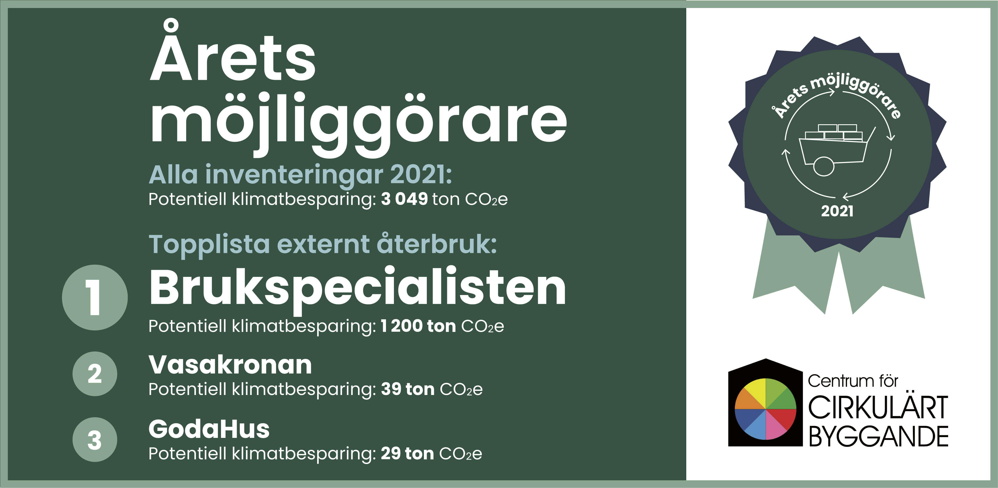 Nu står det klart: Brukspecialisten är Årets möjliggörare! De har stått för den största insättningen i CCBuilds produktbank under 2021. Deras bidrag under året innebär att utsläppen av växthusgaser kan minska med minst 1 200 ton.